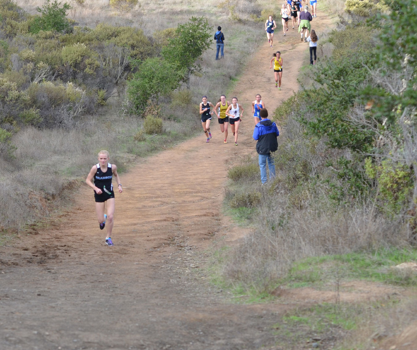 I think all but one of the top 10 girls set PR’s. Julia Maxwell (Branson) breaking 18 minutes and running a 17:57 was one of the best. Anna Harleen (Branson), Bella Amyx (Tam), Megan Bordes (Redwood), Isabel Moon (Novato), Kelsey Neiman (Novato), all did much better time wise than last year, but how about the ‘Poster Girl’ for your ranmarin summer training program ( Sophia Noto of Drake ). She went from 33rd place to 9th and dropped a full 2 min. off last years time.
