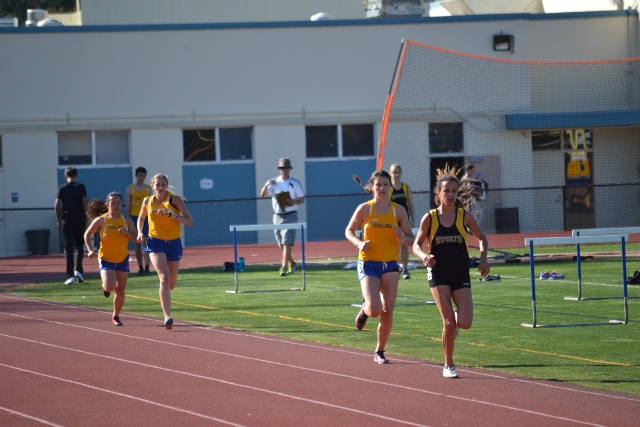 Leading the Varsity Girls 1600 meter run is Raissa Boysen of Novato who went on to win in a time of 5:33. Jessica Silveira of Terra Linda was second with a time of 5:35.