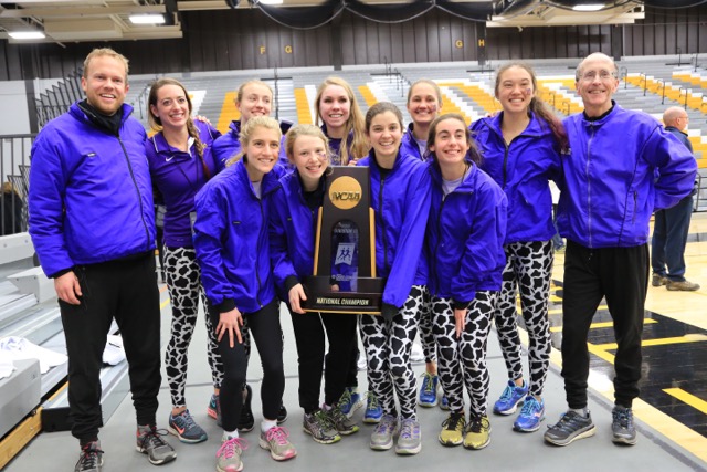 William’s Anna Harleen (Branson) sprinted to the finish to help her team win the NCAA Dlll title for the first time since 2004. Anna, a sophomore, placed 39th running the 6km course in 21:49.3. The race was won by Abrah Masterson of Cornell College in 21:23.1. In the photo below Anna is holding the trophy on the right side.