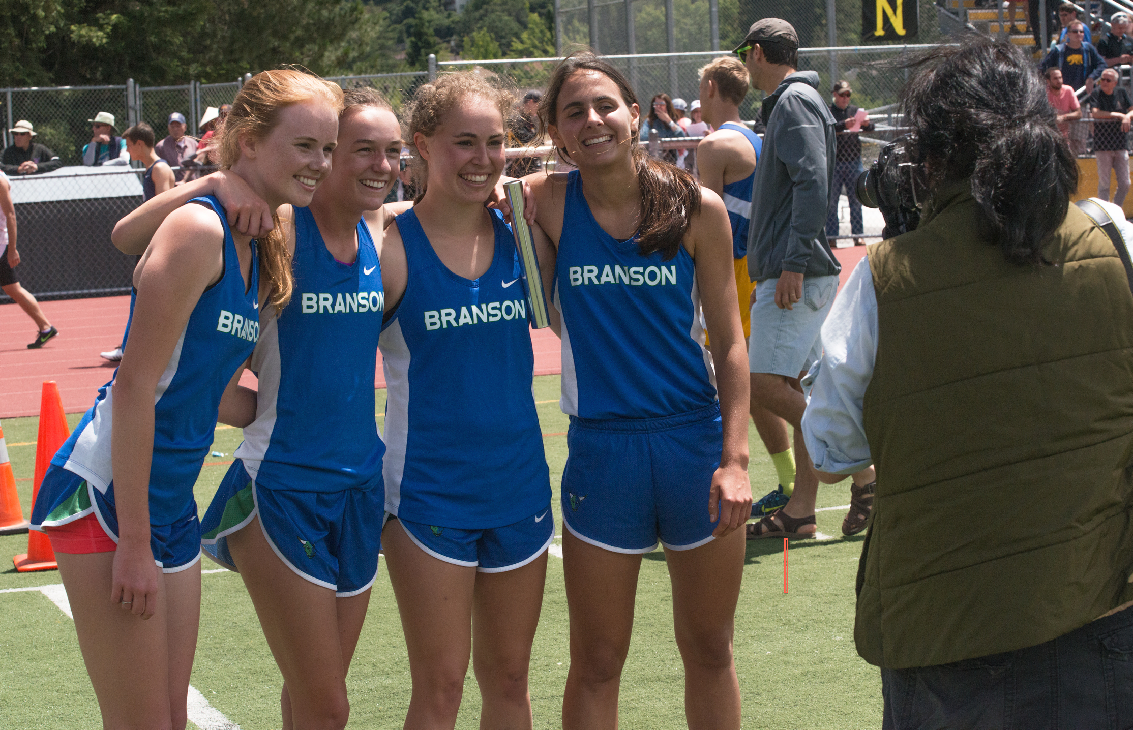 The Branson Girls 4 X 400 team upset the favorites for the win in 4:12.22, winning the relay for the first time in Branson history. Left to right Ellie Packard, Olivia Weisel, Charlotte Oster and Grace Dailey.